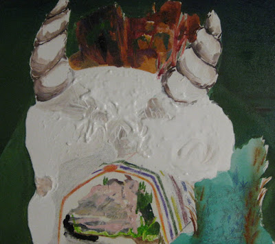 CRAAAAAZZZY!!!!! This is something I'm working on for a materials and techniques class. I think I'll just resolve the upper right corner and then it will be done. It's gouche, acrylic, watercolor, and graphite on paper. I think it's 25" x 35" or something like that.